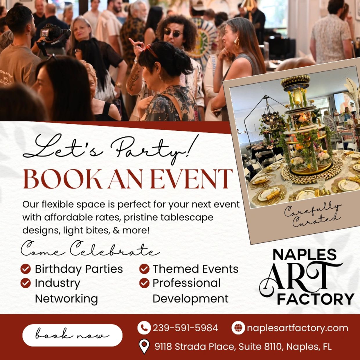 Are you searching for a unique venue to host a party in Naples, Florida? Conveniently located in the heart of the fashionable Mercato, Naples Art Factory is the premier choice for your next event.